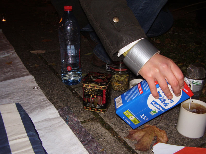 HEIMLEUCHTEN MIT TEE*LICHT*HUPEN | Medium: offenes Atelier, Nachbarschaftstreffen, gemeinsames TeeTrinken, unangemeldete Laternen-Demo mit polizeilicher Reaktion Preparazione (-> K. Alsleben): Telefonische Abstimmung, E-mail-Einladungen, Verkleben von Einladungskarten an Ampelmasten an und auf der Kreuzung Techniken/ Artistiken: AnSpiele mit Teelichtinstalationen und dem öffentlichen Zubereiten von Tee; anknüpfbare Konventionsverrückungen; Verkörperung von zivilem Ungehorsam Materialien: Mehrere 100 Teelichter, kleine Gläser, lange Zündhölzer, Buntpapier, Blumenbindedraht, Klebeband, lange Schaschlikspieße, Tapetenrolle Versorgung: Tee, - vor Ort mit Camping-Gaskocher zubereitet Ausstattung: Scheren, Cutter, Handbohrer, Blechkiste, Matte, Filzunterlage Transport: Fahrräder, Tragetaschen Beteiligte AutofahrerInnen: < 3.000 Institutionelle Kooperationspartner: Akteure des "Bürgerbüro Alt-Barmbek" Steigerung dialogischer Austausche durch 2. LustwandelTag: 2.400% Soziokulturzuwachs Begegnungen mit der Polizei: 2 Einsätze Witterung: trocken, kalt Künstlerische Assistenz: B. v. Oer Künstlerische Leitung: B. Seithe, V. Lettkemann Erfahrungen/ Ergebnisse: Im Dunkeln ist gut funzeln ... ( ![]() Zusammen mit anderen auf einer Vekehrsinsel Tee*Licht*Hupen zu kreieren, zum Leuchten zu bringen, ist schön. Die Schrägheit des Ortes, der Wind und die zunehmende Abendkälte werden orangefarbend heimgeleuchtet. Schön ist auch, dass es gelungen ist, AnwohnerInnen durch Mail-Einladungen für das LustWandeln zu interessieren. Glühwein und ein schrilles Megaphon sind unerwartete Mitbringsel. Wie Selbstverständlich, erkennt eine Gruppe vorbeikommender jugendlicher Mädchen den 2. LustWandelTag als zweckfreies zwischenmenschliches Spiel, baut gemeinsam Tee*Licht*Hupen und zieht weiter ...