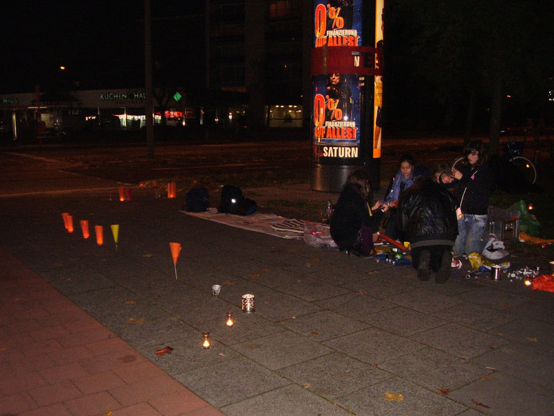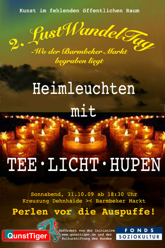 2. LustWandelTag: HEIMLEUCHTEN MIT TEE*LICHT*HUPEN Samstag, 31.10.09 ab 18.30 Uhr, Kreuzung HH-Dehnhaide ![]() ![]() ![]() ![]() ![]() ![]() ![]() ![]() ![]() ![]() ![]() ![]() ![]() Polizeibeamter: "Wer ist hier verantwortlich, für diese Veranstaltung?" - Welche VerAnstaltung? Das lustwandlerische Aufstellen von ein paar Teelichtern auf Betonplatten oder das Begraben des Barmbeker Marktes unter einer Straßenkreuzung mit annähernd 30 Fahrspuren? - Ach ja, es geht um Veranstaltungen, nicht um VerUnstaltungen eines Stadtteils seit einigen Jahrzehnten. Ergebnis: Aufforderung, Teelichtlaternen vom Straßenrand und mittlerer Verkehrsinsel aus Gründen der Verkehrssicherheit zu entfernen, ansonsten Ermahnung, Duldung und einen schönen Abend noch! ![]() ![]() ![]() ![]() ![]() ![]() ![]() ![]() ![]() ![]() ![]() ![]() ![]() "Alles klar?! - Ihre Kollegen waren schon da ..." ![]() ![]() ![]() ![]() ![]() ![]() ![]() ![]()